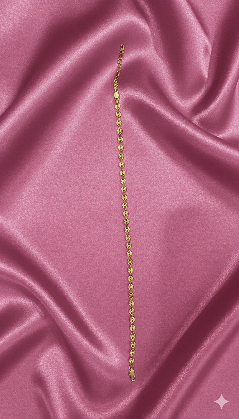 Cette gourmette en XP est composé d'une série de petits maillons ronds et plats, interconnectés pour former une chaîne délicate et élégante. Chaque maillon est de couleur dorée avec une finition polie et brillante, créant un reflet subtil. La gourmette est équipé d'un fermoir à mousqueton pour le sécuriser. Ce bijou au design classique est parfait pour un usage quotidien et se marie bien avec d'autres gorumettes pour un effet de superposition.