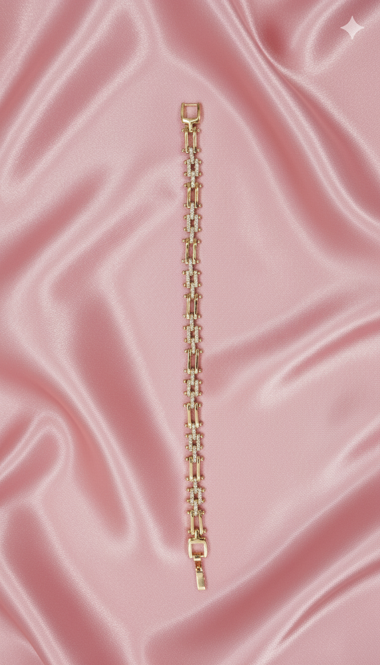Cette gourmette se distingue par une chaîne en XP, alternant des sections polies lisses avec des sections incrustées de petits diamants étincelants. Cette combinaison crée un contraste élégant entre l'éclat des pierres et la couleur dorée. Le fermoir, de type boîte ou rabattable, s'intègre discrètement au design.